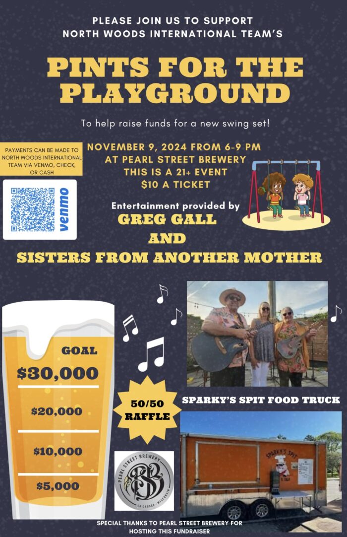 This fundraising event will help add swings to the playground at North Woods International Elementary. There will be a 50/50 raffle, and the Pearl St. Brewery is kindly donating $1 per drink to the cause!
