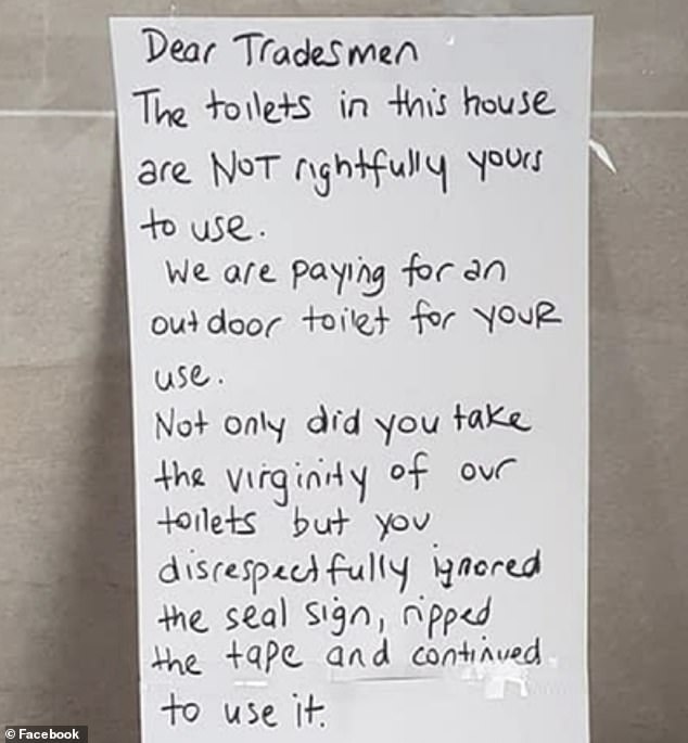 Now, I wouldn’t refer to it as “toilet virginity”, but I can completely understand the anger & frustration this woman felt after her toilet was used without permission. ESPECIALLY since they were providing a porta-potty for the people working on their house.