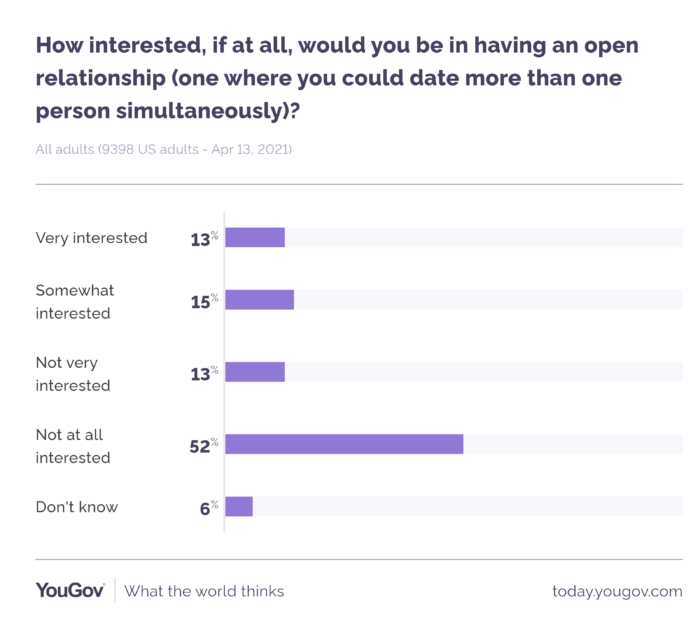 But according to a new survey of almost 10,000 Americans, 28% of people say they’d be interested in an open relationship, which they define as “where you could date more than one person simultaneously”.