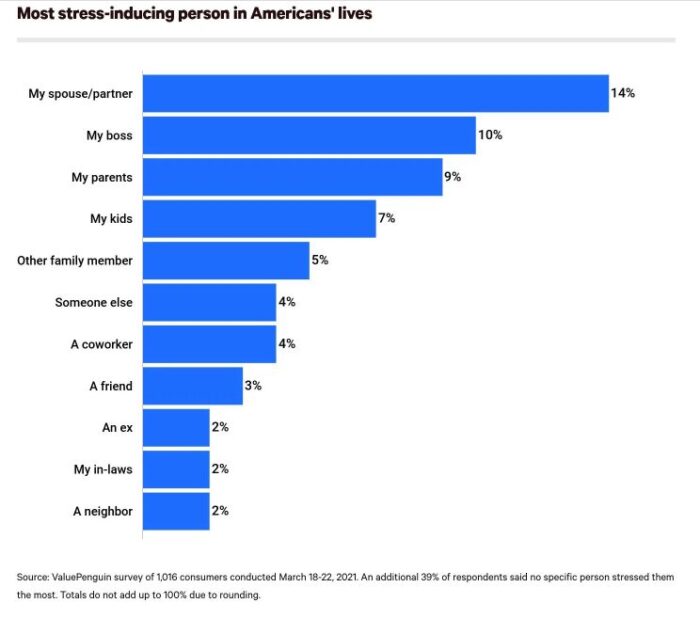 But according to a new survey, “spouse or partner” was the most stressful person in your life, with 14% of the vote.