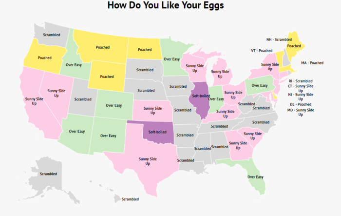 Sunny side-up took 14 states, including Wisconsin. Over easy was the most popular choice in 8 states, including Minnesota, and ‘poached’ was the most popular way to prepare your eggs in eight states, as well.