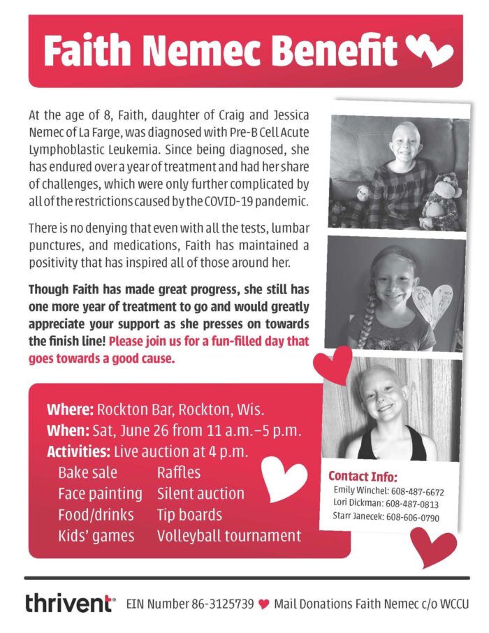 There will be a benefit for Faith & her family on Saturday, June 26th at the Rockton Bar in La Farge from 11am until 5pm.