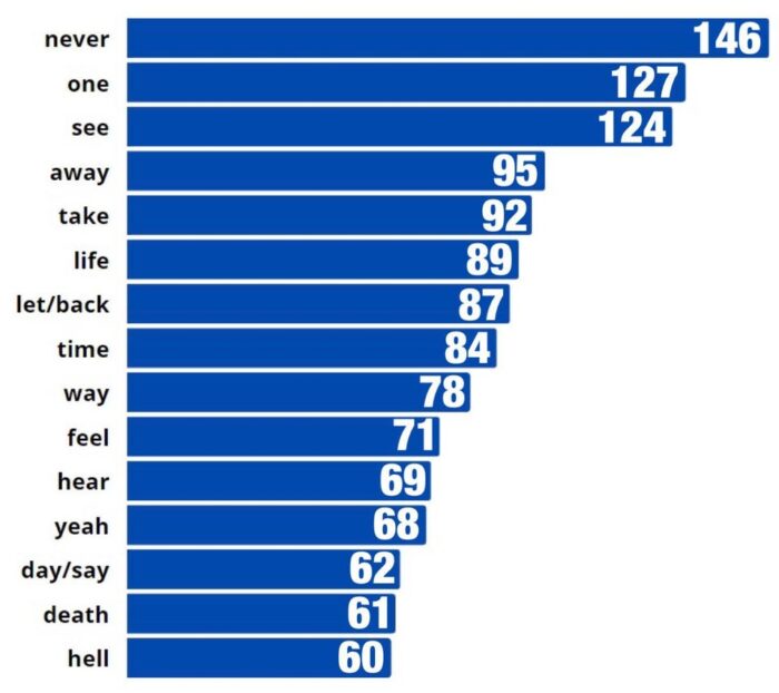 The most common word is “Never”, which gets used 146 times. The rest of the top ten are: