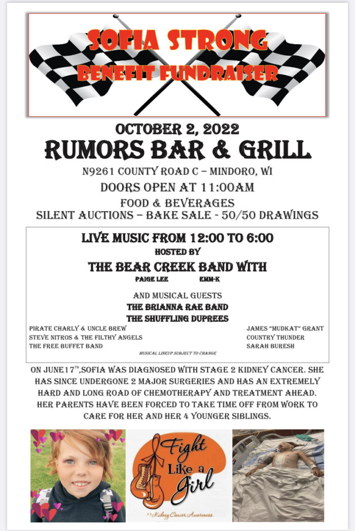Her family has set up a GoFundMe account to help offset their rising medical bills, and there will be a benefit for Sofia on Sunday, October 2nd at Rumors Bar & Grill in Mindoro starting at noon.