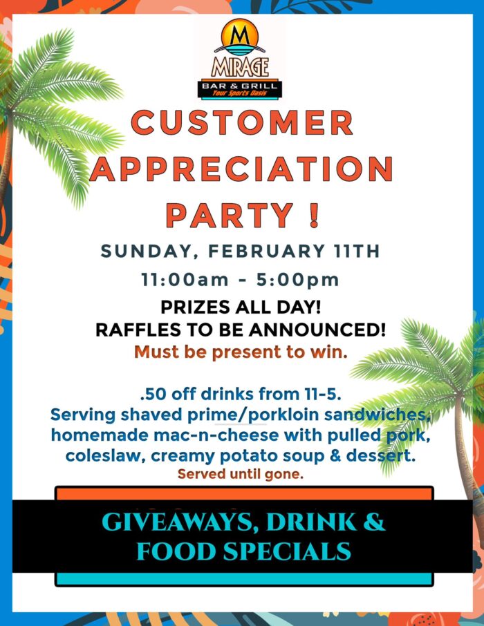SUNDAY – CUSTOMER APPRECIATION PARTY @ THE MIRAGE SPORTS BAR