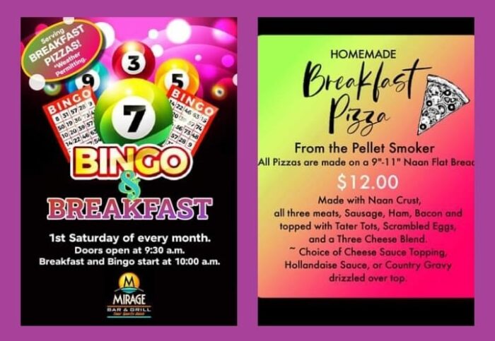Get to the South-side on Saturday morning for breakfast & bingo at the Mirage Sports Bar & Grill. Their breakfast pizza is made with Naan bread on their smoker & is just $12!