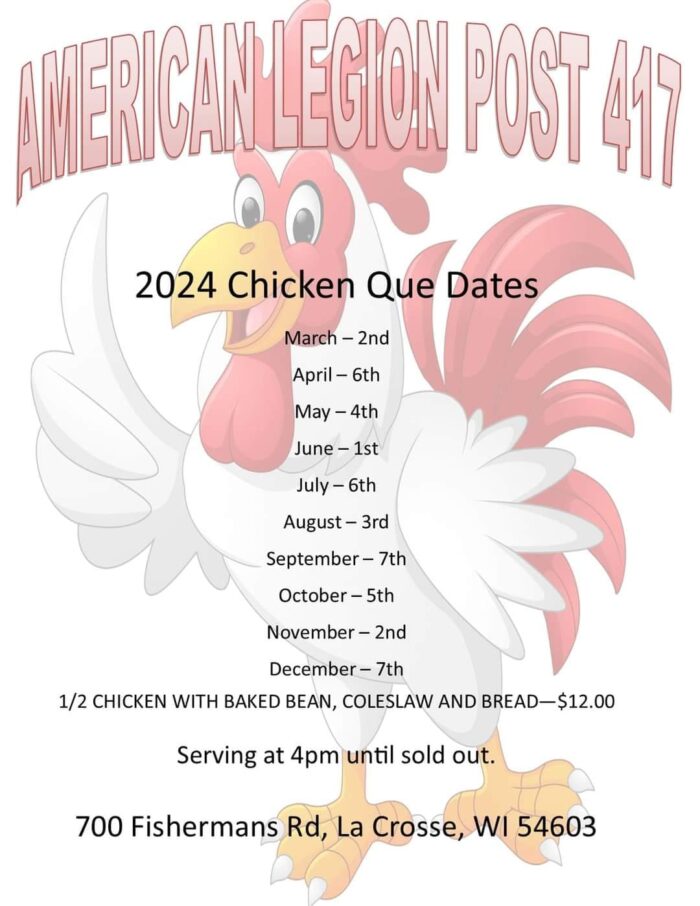 It’s Chicken-Q season, and this week’s Q is at the American Legion Post 417 on French Island on Saturday afternoon from 4-7pm(or gone).
