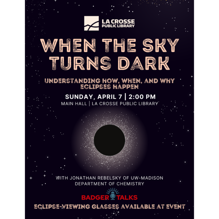 The La Crosse Public Library is hosting UW-Madison speaker Jonathan Rebelsky, an Analytical Chemistry PhD Candidate in the Department of Chemistry, to talk about the upcoming solar eclipse & to help you better understand how, why, & when eclipses happen.