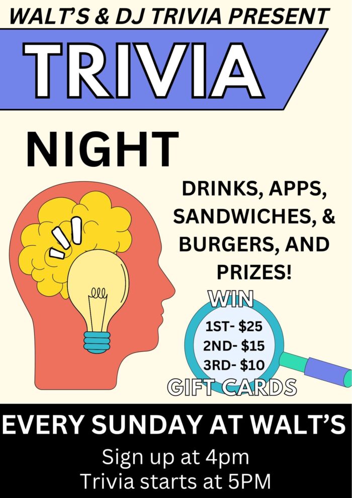 SUNDAY – TRIVIA @ WALT’S RESTAURANT & TAVERN IN BANGOR