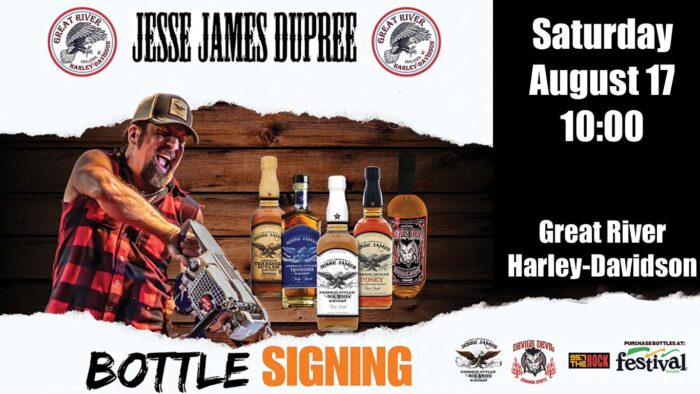 At 10am on Saturday morning, there will be a bottle signing with Jesse James Dupree of Jackyl at Great River Harley-Davidson. You can purchase bottles of Jesse James spirits at local Festival Foods & bring them with you to Harley.