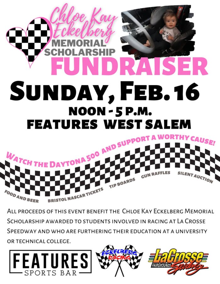 The annual Chloe Kay Eckelberg Memorial Scholarship fundraiser is this Sunday at Features in West Salem starting at noon & leading up to the Daytona 500.