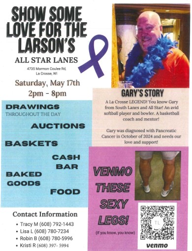 There will be a benefit for Gary on Saturday, May 17th from 2-8pm at All Star Lanes & Banquets in La Crosse.