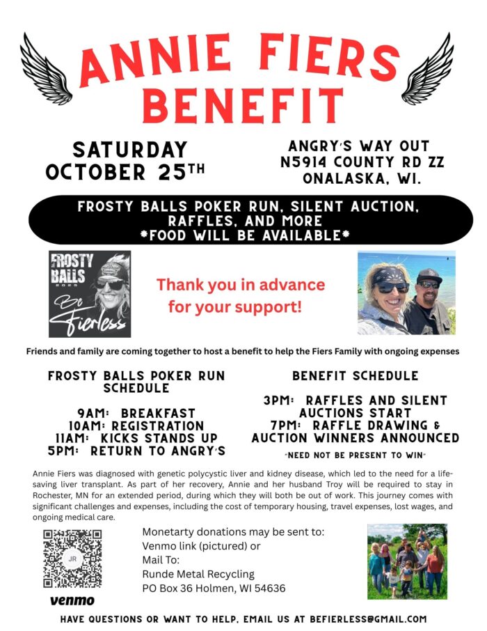 There will be a benefit for Annie on Saturday, October 25th from 3-7pm at Angry’s Way Out on Brice Prairie. This benefit is in collaboration with the Frosty Balls Poker Run being held the same day.