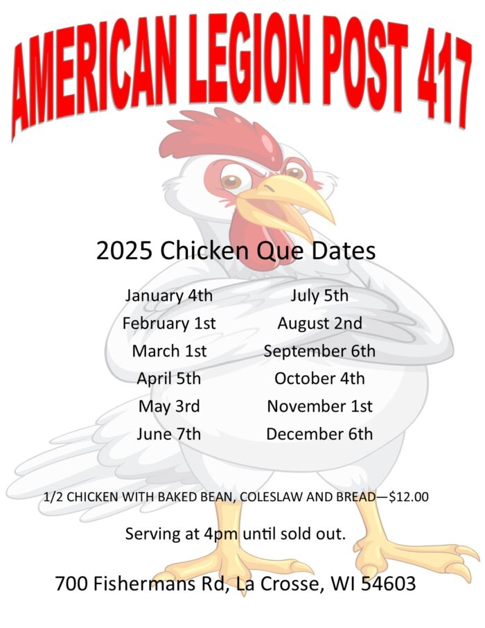 Chicken-Q’s are hard to come by this time of year, but on Saturday afternoon you can stop by the American Legion Post 417 on French Island for a Q starting at 4pm.