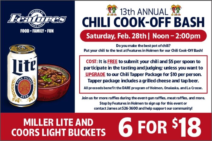 So, if you’ve got a killer chili that you want to put to the test, then get to Features in Holmen on Saturday starting at noon for their 13th annual Chili Cook-Off!