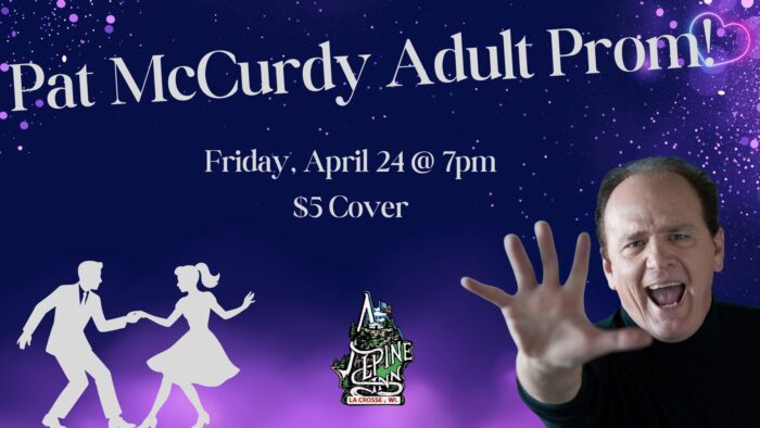 Right around the same time the high schools are having their proms with pictures at Riverside Park & limo rides to the dance, we’re getting our duffs up the bluff to the Alpine Inn for Adult Prom with Pat McCurdy.